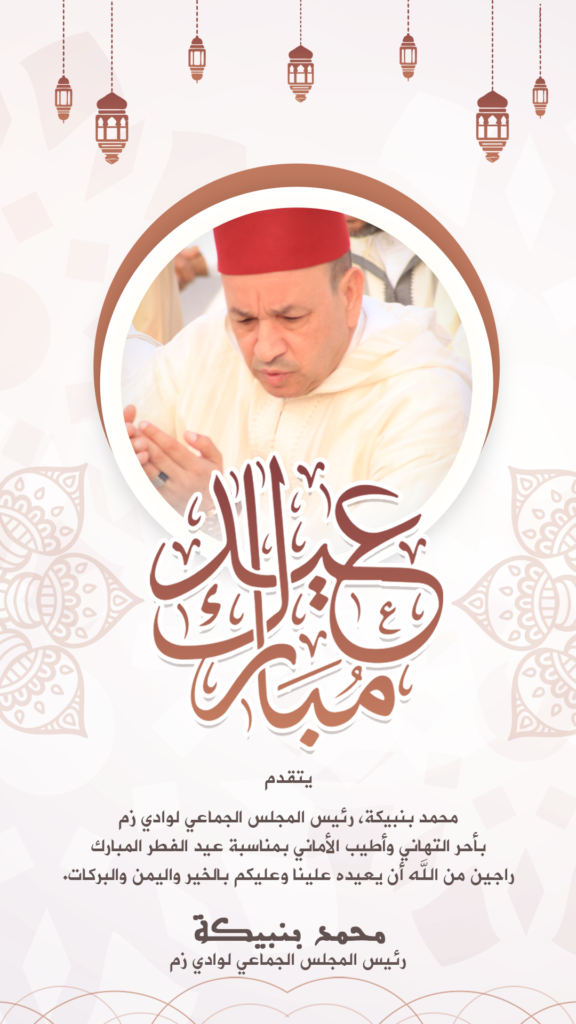 بمناسبة حلول عيد الفطر المبارك، تتقدم جماعة وادي زم، ممثلة في رئيسها محمد بنبيكة، رئيس المجلس الجماعي لوادي زم، بأحر التهاني وأطيب الأماني إلى ساكنة المدينة وكافة المواطنات والمواطنين، وإلى عموم الشعب المغربي.