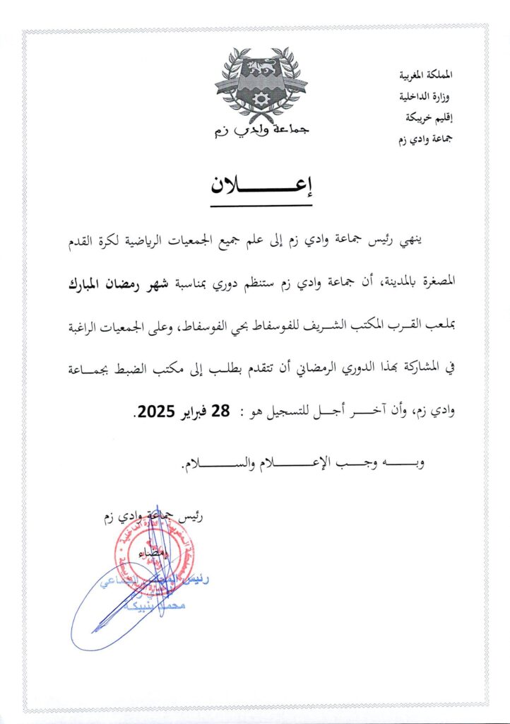 في إطار أنشطتها الرياضية، تنظم جماعة وادي زم الدوري الرمضاني لكرة القدم المصغرة بملعب القرب المكتب الشريف للفوسفاط – حي الفوسفاط، بهدف تعزيز الروح الرياضية والتنافسية بين الفرق المحلية.