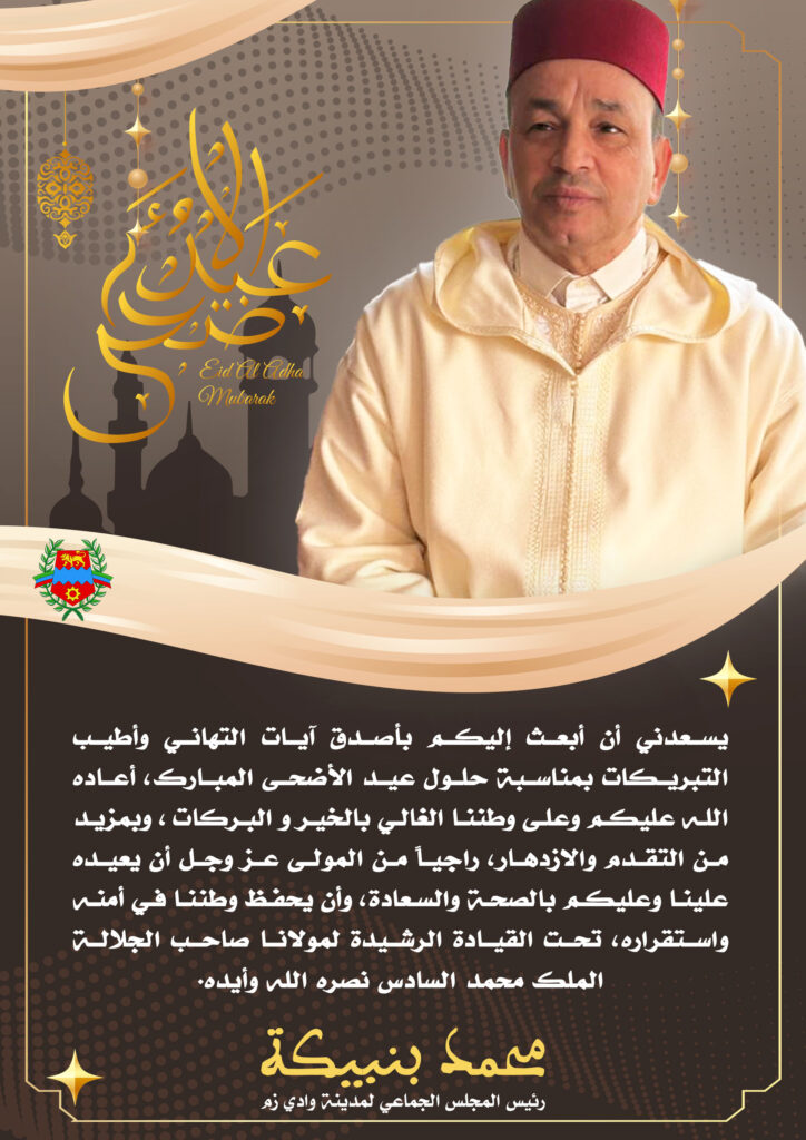 ✨ بـمـنـاسـبـة عـيـد الأبـحـى الـمـبـارك 2025، يـتـقـدم الـسـيـد مـحـمـد بـنـبـيـكـة، رئـيـس جـمـاعـة وادي زم، بـأحـر الـتـهـانـي وأطـيـب الأمـانـي، راجـيـاً مـن الله أن يـعـيـده عـلـى جـمـيـع الـمـغـاربـة بـالـخـيـر والـبـركـة، وكـل عـام وأنـتـم بـألـف خـيـر 🌙